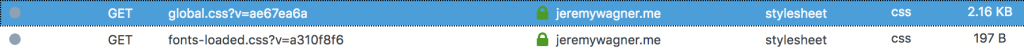 id responseEnd requestStart process code size request path 13 +50.28ms +1.07ms 49.21ms 200 3K / 2 +50.47ms * +42.10ms 8.37ms 200 2K /css/global.css 4 +50.56ms * +42.15ms 8.41ms 200 157 /css/fonts-loaded.css 6 +50.59ms * +42.16ms 8.43ms 200 279 /js/ga.js 8 +50.62ms * +42.17ms 8.44ms 200 243 /js/load-fonts.js 10 +74.29ms * +42.18ms 32.11ms 200 5K /img/global/jeremy.png 17 +87.17ms +50.65ms 36.51ms 200 668 /js/lazyload.js 15 +87.21ms +50.65ms 36.56ms 200 2K /img/global/book-1x.png 19 +87.23ms +50.65ms 36.58ms 200 138 /js/debounce.js 21 +87.25ms +50.65ms 36.60ms 200 240 /js/nav.js 23 +87.27ms +50.65ms 36.62ms 200 302 /js/attach-nav.js |