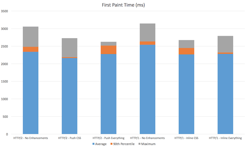 接下来我们讨论结果。最慢的情形是未使用任何优化的 HTTP/2 和 HTTP/1。可以看到,对 CSS 使用 Server Push 使页面渲染平均速度提升了 8%,而内联 CSS 也比简单的 HTTP/1 提升了 5% 速度。