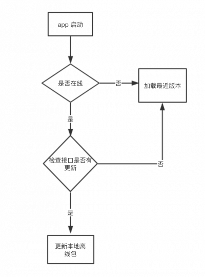 事实上,我们的大部分离线场景将是会在本地独立 app 之中,借助客户端能力,我们可以把 web 代码包提前内置到客户端之中,然后使用一套代码更新机制,前端代码缓存问题可以得到解决。离线代码加载和更新逻辑本身不复杂,下面是一个简化图,具体特定业务场景下还需要考虑比如是否灰度用户,代码版本和数据是否同步等问题。