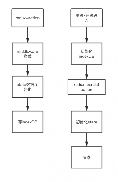 对于项目使用了 redux 数据管理的项目而言,最快捷的办法,就是使用 redux-offline,其基本思路是通过 redux middleware 监听每次 acton 数据变化,然后将需要离线的数据序列化到本地(对于 web 浏览而言存储兼容顺序是 indexdb—websql—localstorage),等下一次刷新页面时,优先从本地还原数据还原到 store 中。这种方案的好处是快速配置需要缓存的 API 接口到中间件即可,充分结合了 redux 特性,对于想要达到简单优先展示离线数据的应用而言,是非常不错的。