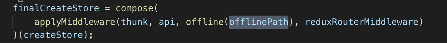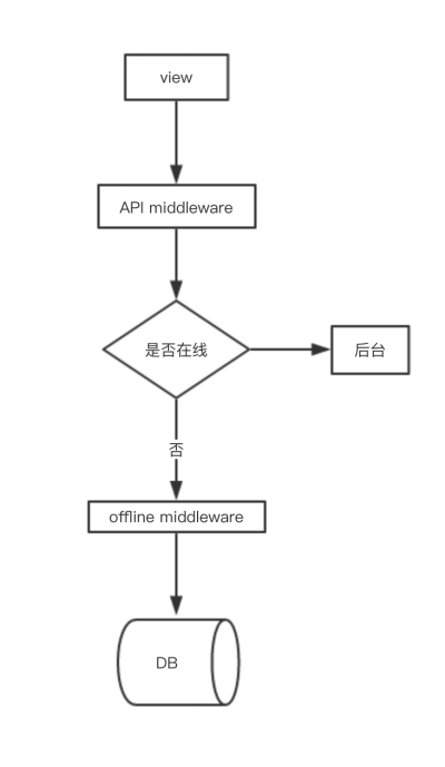 比较合适的做法是,单独抽出一层 redux 中间件,通过配置文件的形式,将需要离线的 API 初始化时传进去,然后在 middleware 中,完成对 DB 的读写操作,将数据组装好给下一个 reducer,我们可以叫 offline 中间件。为了更进一步合理的对 api 参数分解出来,我们也需要在 offline 中间件前将接口请求层再抽象一个中间件,我们叫 API middleware ,这样经过离线中间件的 api 参数已经被分解,可以直接作为查询 db 使用,同时也能服务于后台请求。
